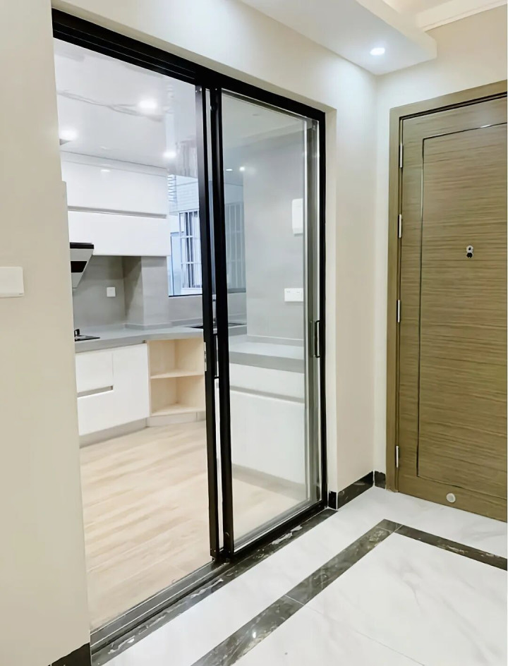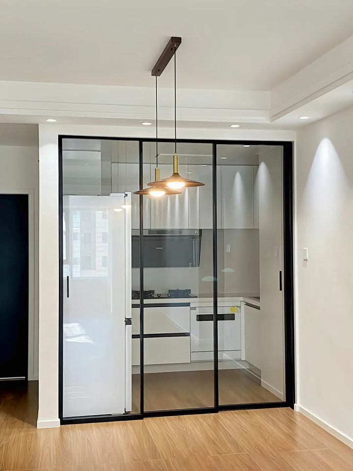 这款门一共由三扇5mm的钢化玻璃组成,嵌入墙体内,平时隐藏在墙里不见踪影,想用的时候轻轻一拉,门就像被召唤出来一样——简直是厨房的“魔法师”!