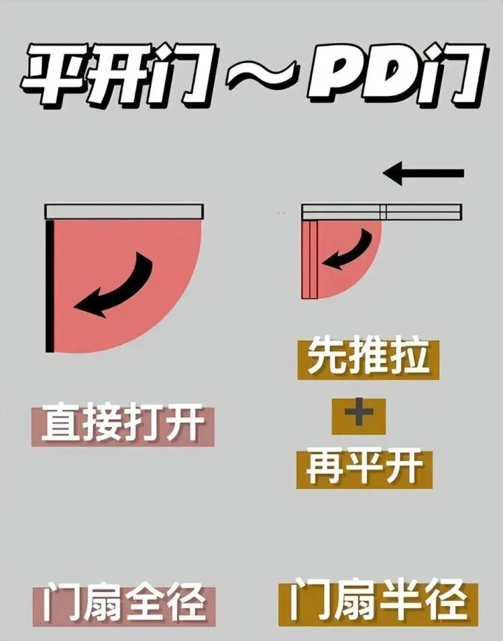而PD门则不同,它能180度“旋转开挂”——先折叠成半扇门,再像打开宝藏一样,平开出去!而且,它紧贴墙面完全不占地方,进进出出比较轻松!